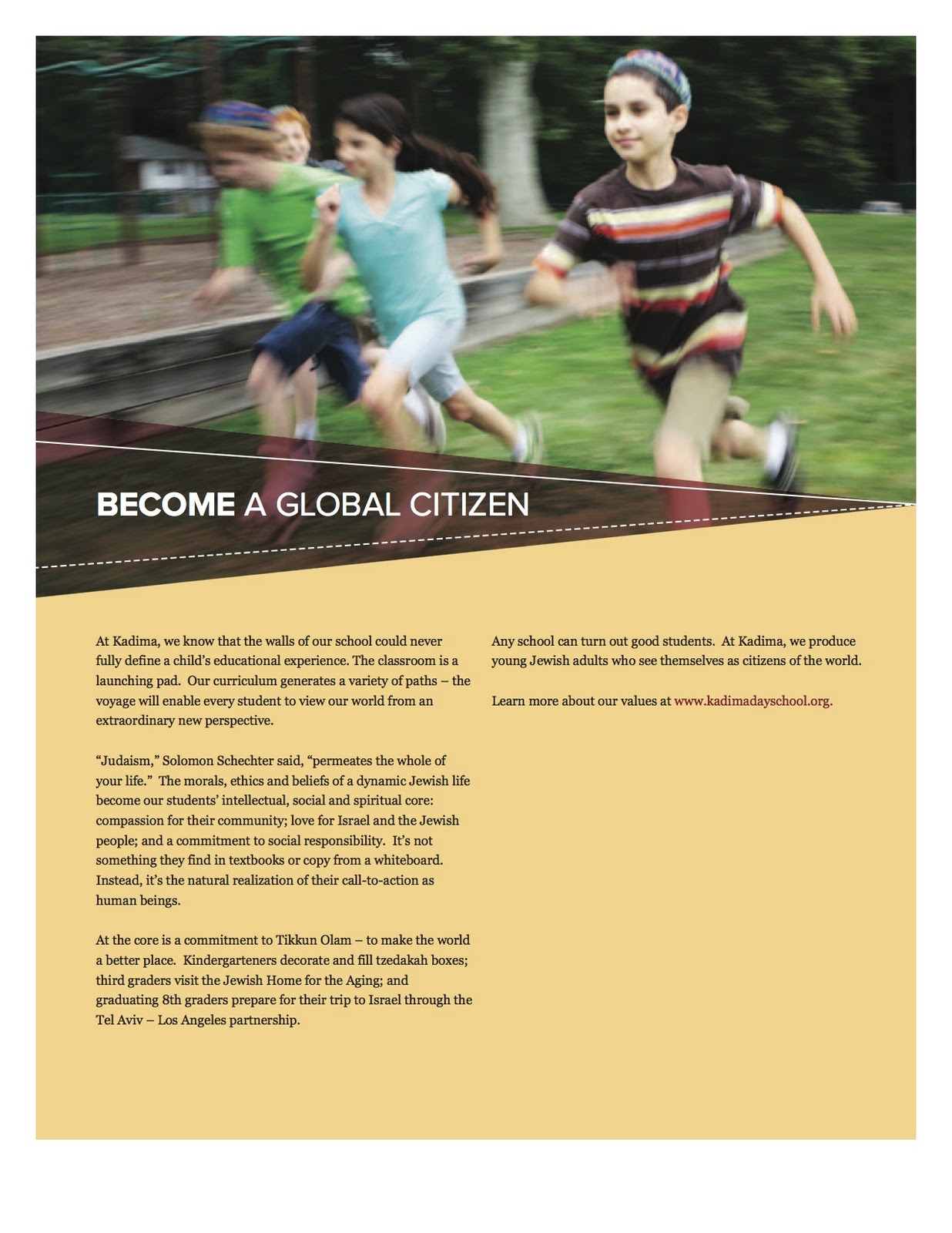 After months of creative work, our new view book is complete! It is entitled "Engage the World" and it does a very nice job in communicating Kadima's core values. Check out some of the pages here....